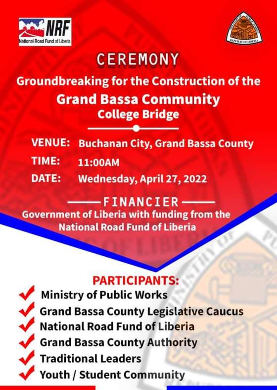 Government of Liberia with funding from the National Road Fund of Liberia to break ground for the construction of the Grand Bassa Community College Bridge.